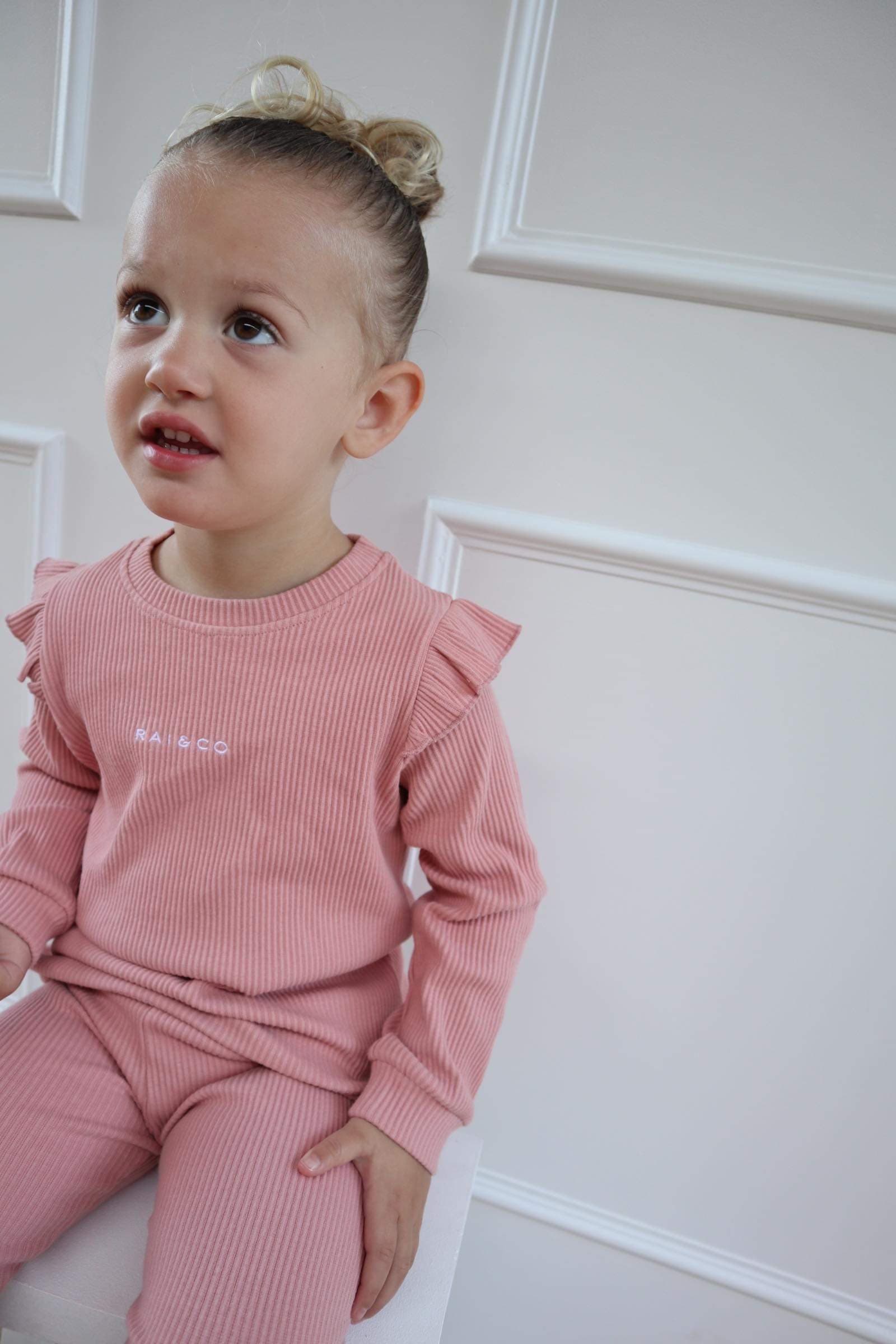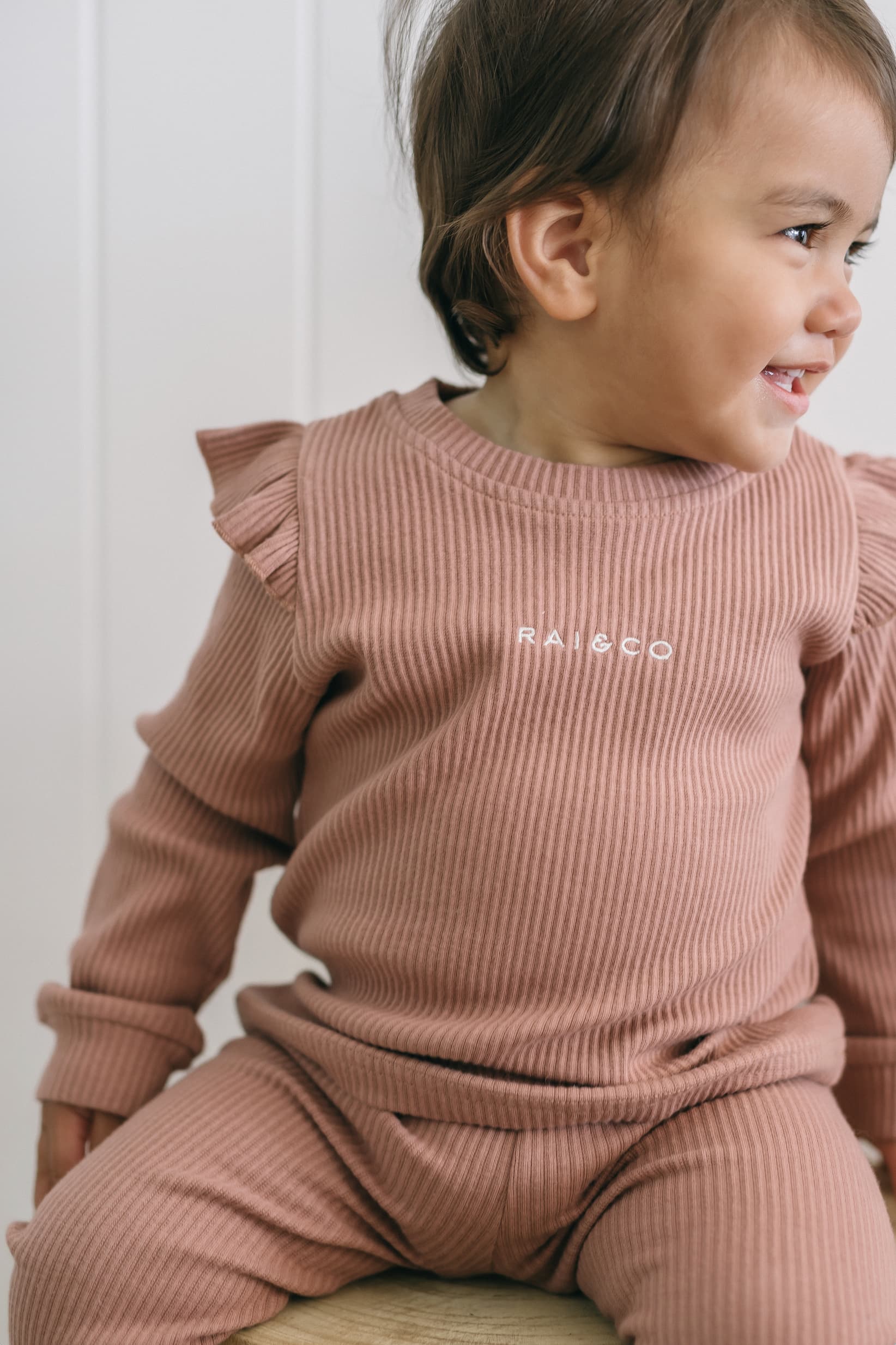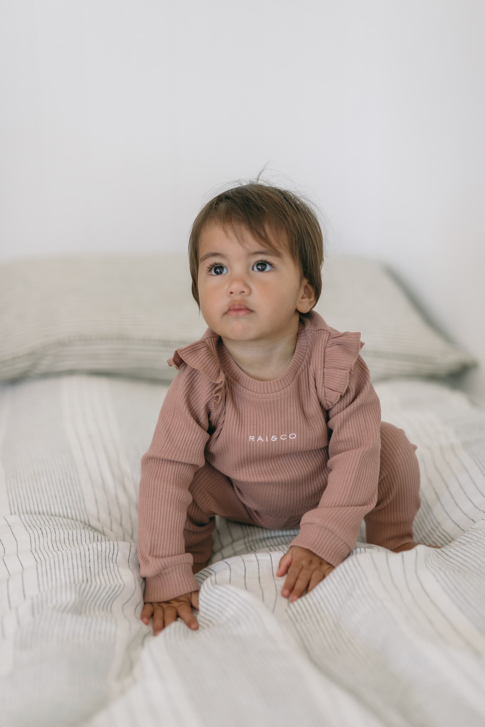 Our favourite frilled ribbed two-piece set is back and we are so excited. This cute little set has the dandiest frilled sleeves and comes in two colour ways. Powder pink and Blush. This garment is made from cotton and spandex so it is perfect for little bodies on the move. Designed to have some stretch, so they are perfect for layering. True to size so we recommend choosing the size your bub currently wears.
