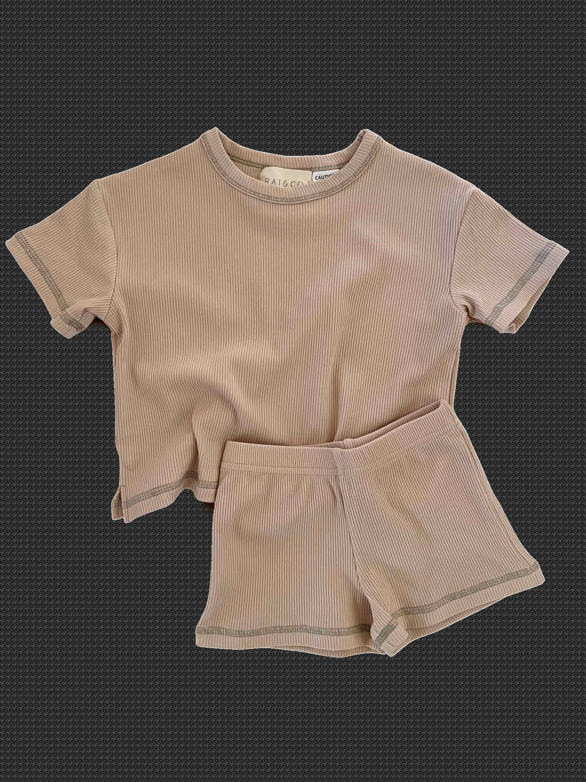 Summer is coming and we can’t wait for you to fall in love with our newest arrival. Super light weight mini ribbed T-shirt pyjama sets. Match your minis with our matching boy or girl sets and rompers. Available in Beige and Blue with contrast stitching.